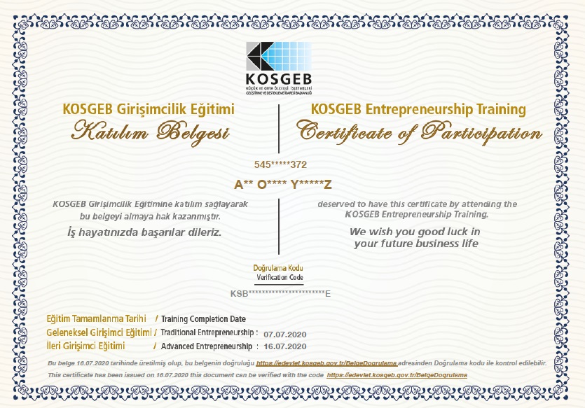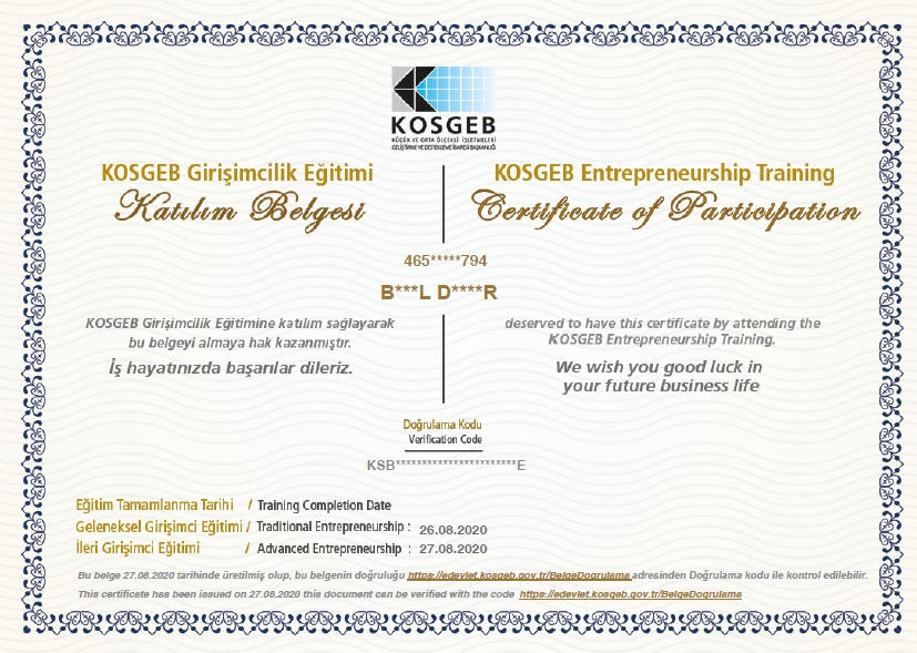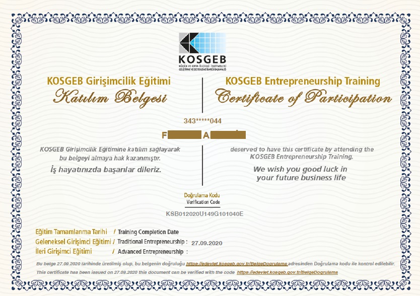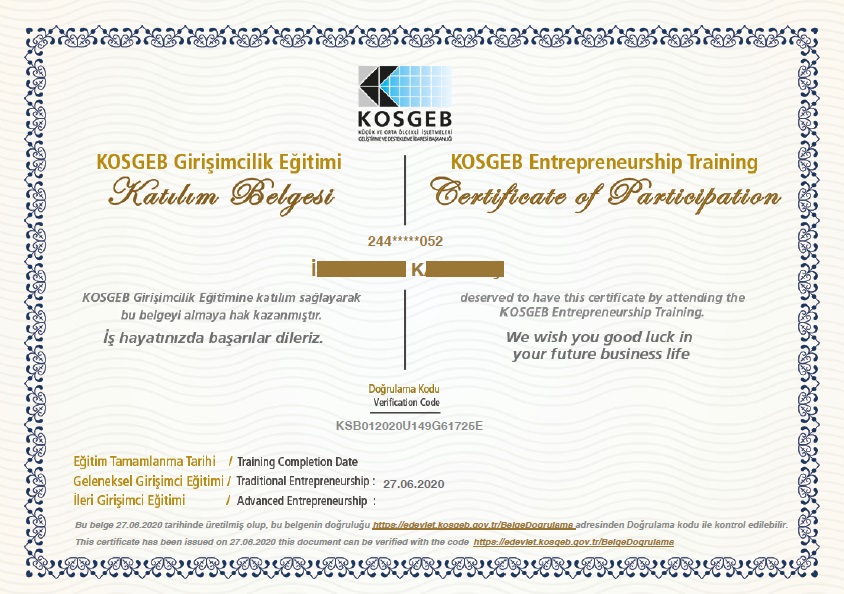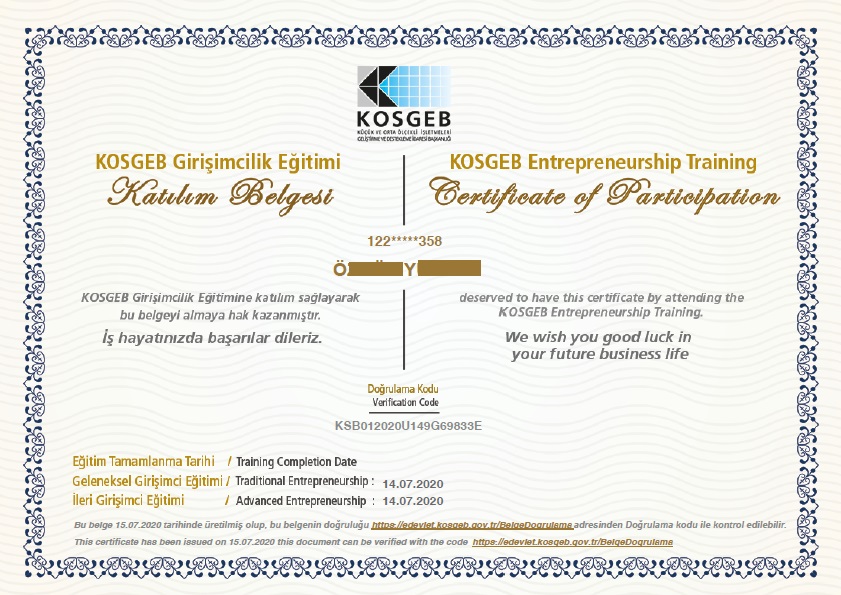 DANIŞMANLIK HİZMETİ VERDİĞİMİZ Ö***** Y*****, KOSGEB DANIŞMANLIĞI VE ÖNERİLERİMİZ DOĞRULTUSUNDA GELENEKSEK GİRİŞİMCİ EĞİTİMİ İLE İLERİ GİRİŞİMCİLİK EĞİTİMİNİ TAMAMLAYARAK SERTİFİKALARINI ALMASI SAĞLANMIŞTIR. BU İŞLEMLER SONUCUNDA KENDİSİNE 5.000 TL HİBE, 40.000 TL HİBE İLE 100.000 TL İLERİ GİRİŞİMCİLİK MAKİNA TEÇHİSAT DESTEĞİ SAĞLANMIŞTIR…!