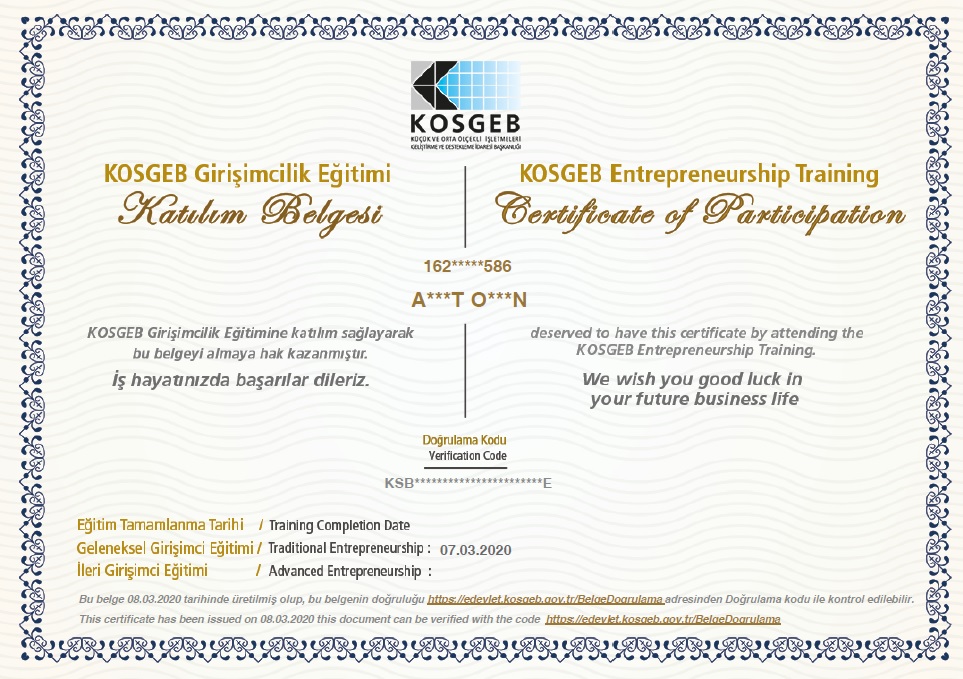 DANIŞMANLIK HİZMETİ VERDİĞİMİZ OSMAN TARIK KÖSE, KOSGEB DANIŞMANLIĞI VE ÖNERİLERİMİZ DOĞRULTUSUNDA GELENEKSEK GİRİŞİMCİ EĞİTİMİNİ TAMAMLAYARAK SERTİFİKASINI ALMASI SAĞLANMIŞTIR. BU İŞLEMLER SONUCUNDA KENDİSİNE 5.000 TL HİBE, 40.000 TL HİBE DESTEĞİ SAĞLANMIŞTIR…!