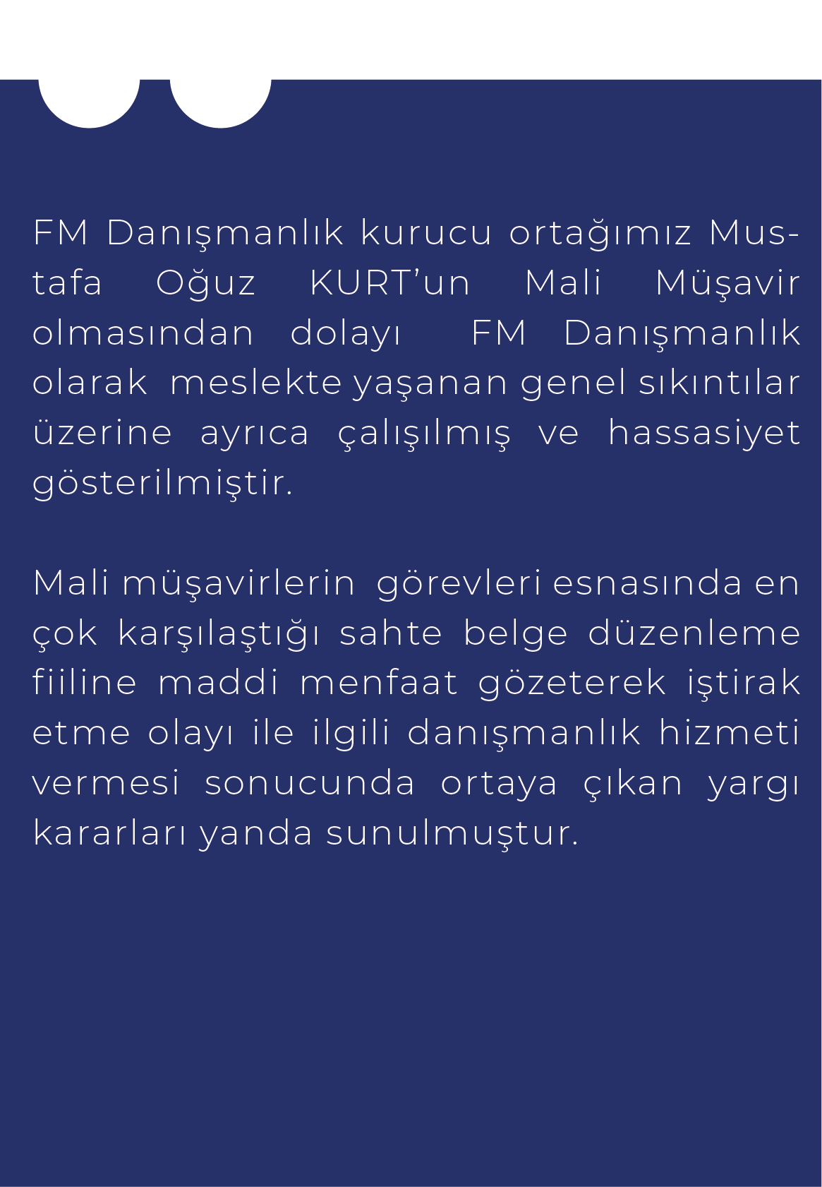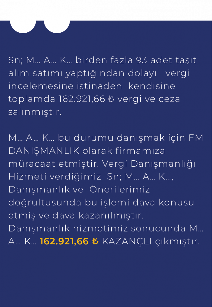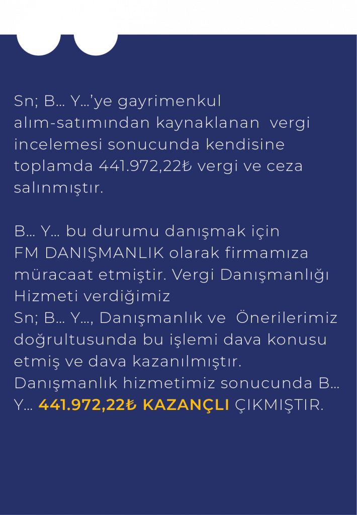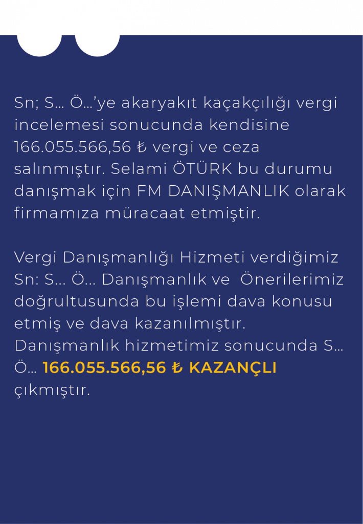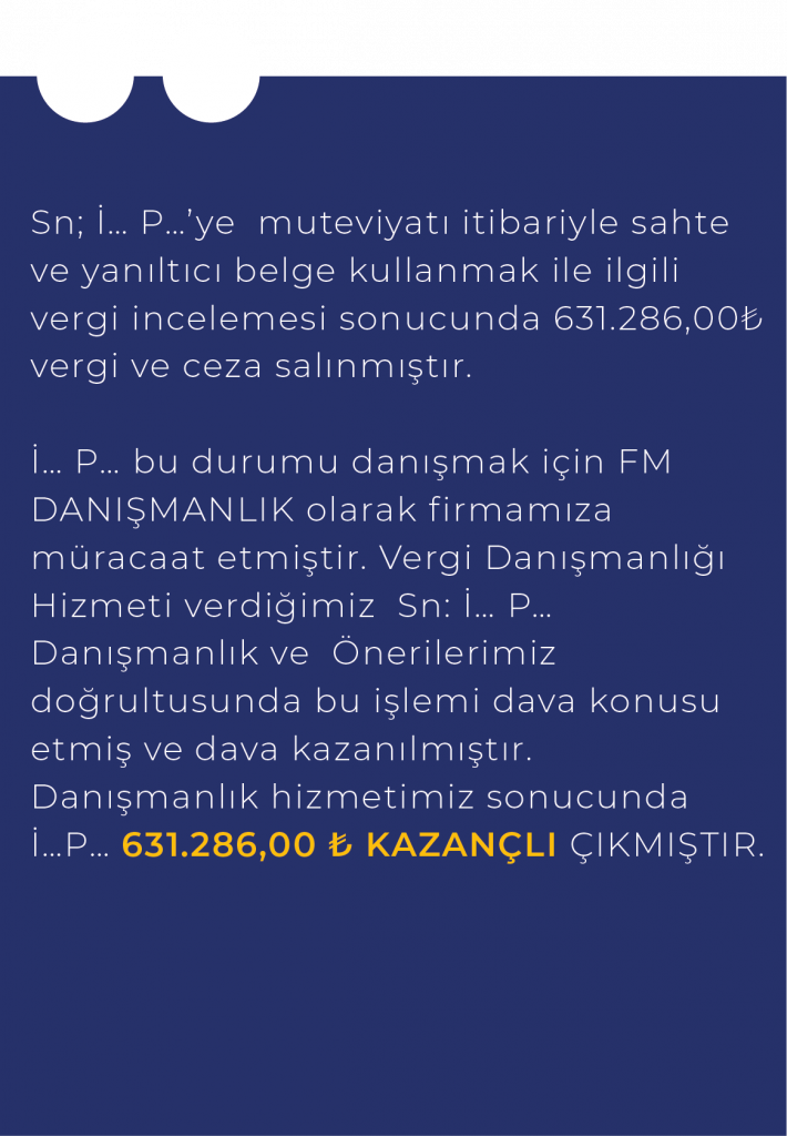 FM Danışmanlık, mükellefler açısından vergi inceleme süreçleri ile vergisel denetim ve revizyon konularında mali danışmanlık hizmetleriyle birlikte vergi mevzuatı bakımından sağlanan teşvik, indirim, istisna ve muafiyetlere ilişkin vergi uyuşmazlıkları ve ihtilaf süreçlerinin değerlendirilerek takip edilmesine yönelik danışmanlık hizmetleri sunmaktadır.
